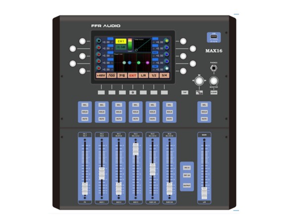 .7寸高清彩色800*480显示屏,7组电容感应触摸推子,配备18段LED实时显示音量位置,通过面板翻页键进行所有通道的音量管理。